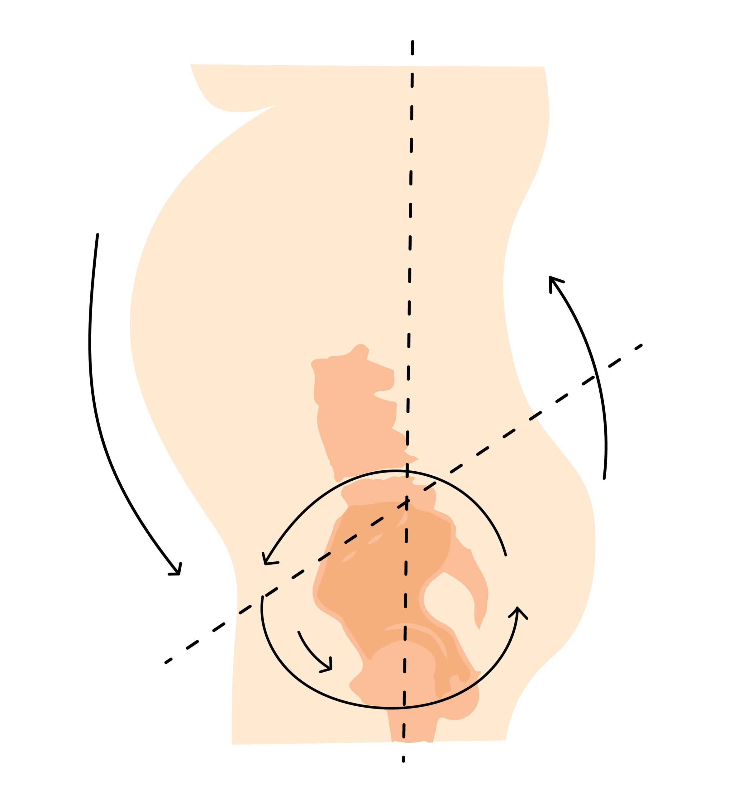 • Uważa się, że mięśnie brzucha, osłabione podczas ciąży z powodu zwiększonego poziomu relaksyny i progesteronu (które rozluźniają mięśnie) lub w wyniku nadmiernego rozciągnięcia mięśni z powodu zwiększonego rozmiaru brzucha, są odpowiedzialne za zwiększenie przedniego pochylenia miednicy (Diagram 1) [7].