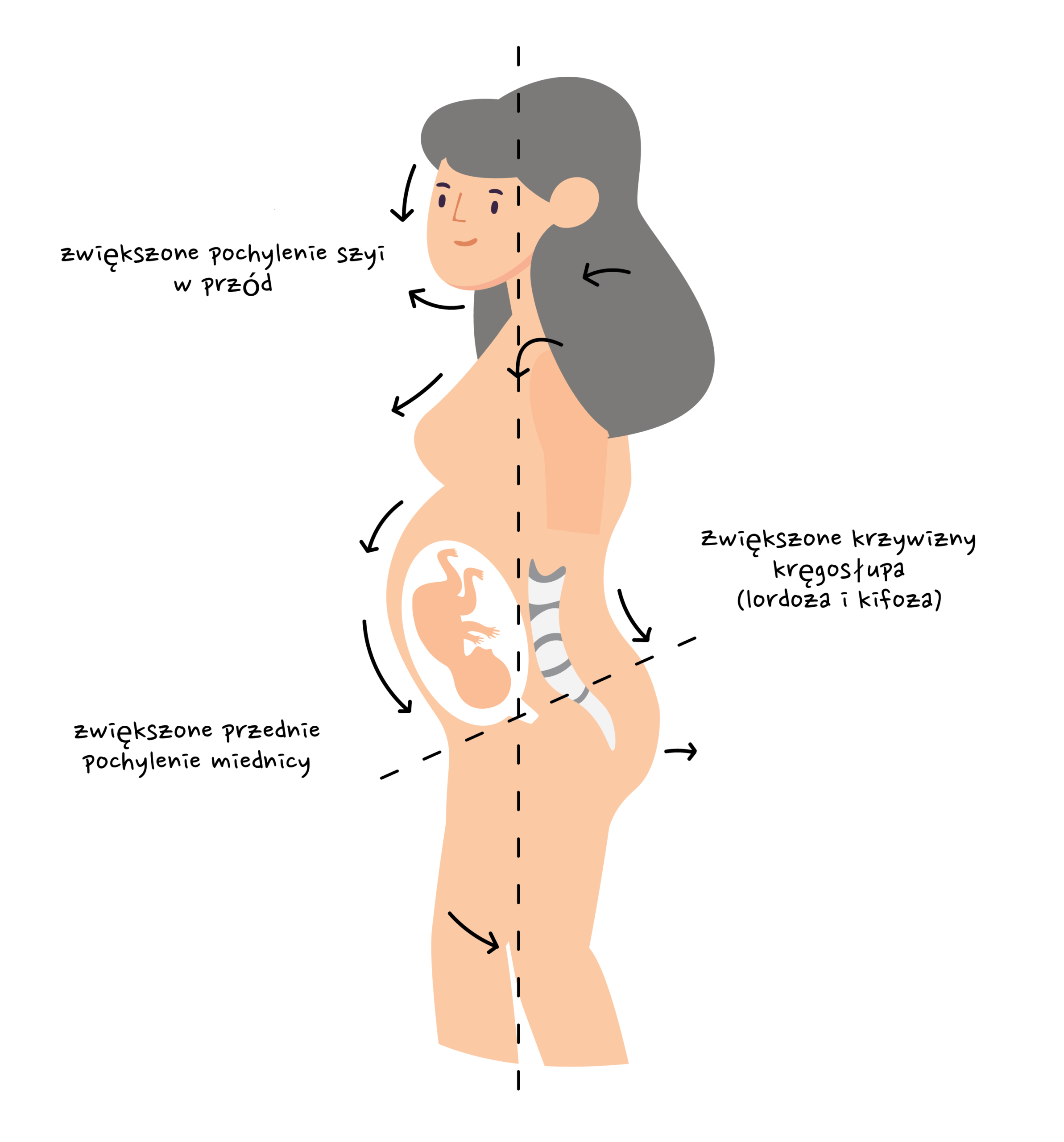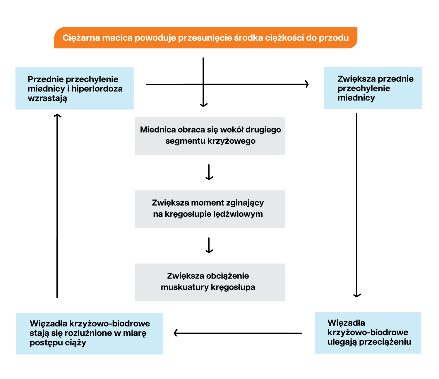 • Ciąża ma głęboki fizjologiczny wpływ na ciało kobiety, wpływając nie tylko na układ sercowo-naczyniowy, hormonalny i moczowy ale także na układ mięśniowo-szkieletowy, w szczególności na kręgosłup. Wyraźne zmiany hormonalne, którym towarzyszy wzrost masy ciała i obecność ciężarnej macicy, powodują przesunięcie środka ciężkości, wywierając w ten sposób dodatkowe obciążenia statyczne i dynamiczne na szkielet osiowy [5].