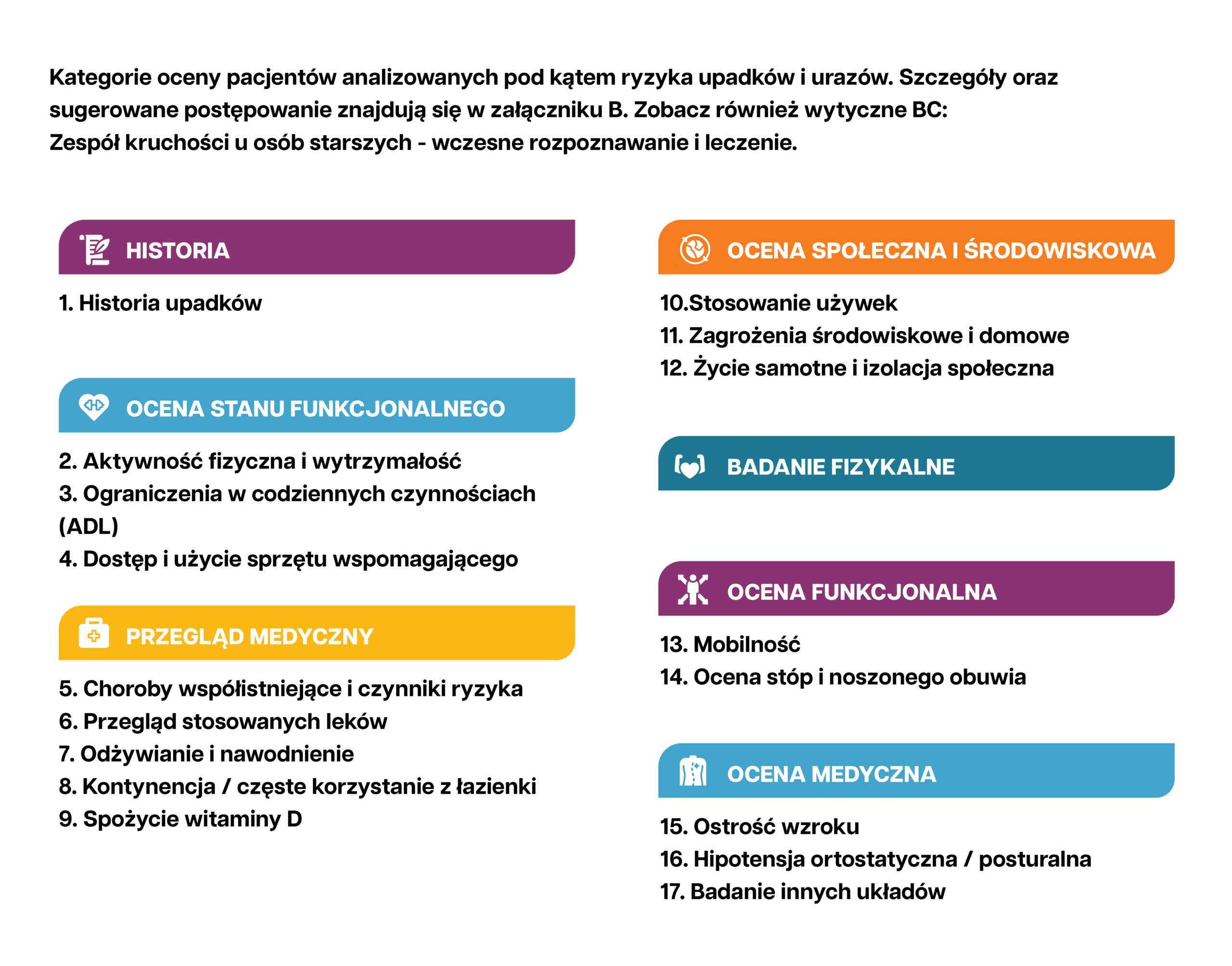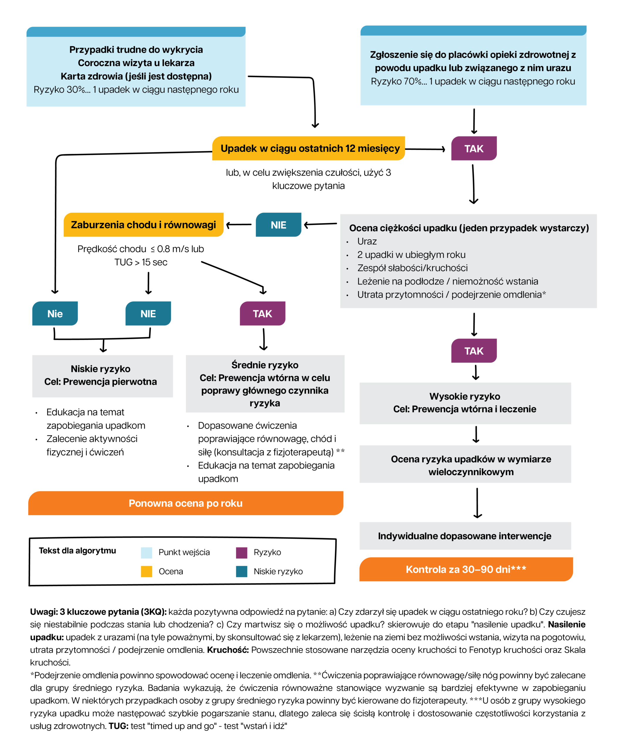 Poniższy diagram przedstawia kroki i działania, które należy podjąć, aby pomóc Ci zrozumieć różne czynniki mające wpływ na ryzyko upadków.
