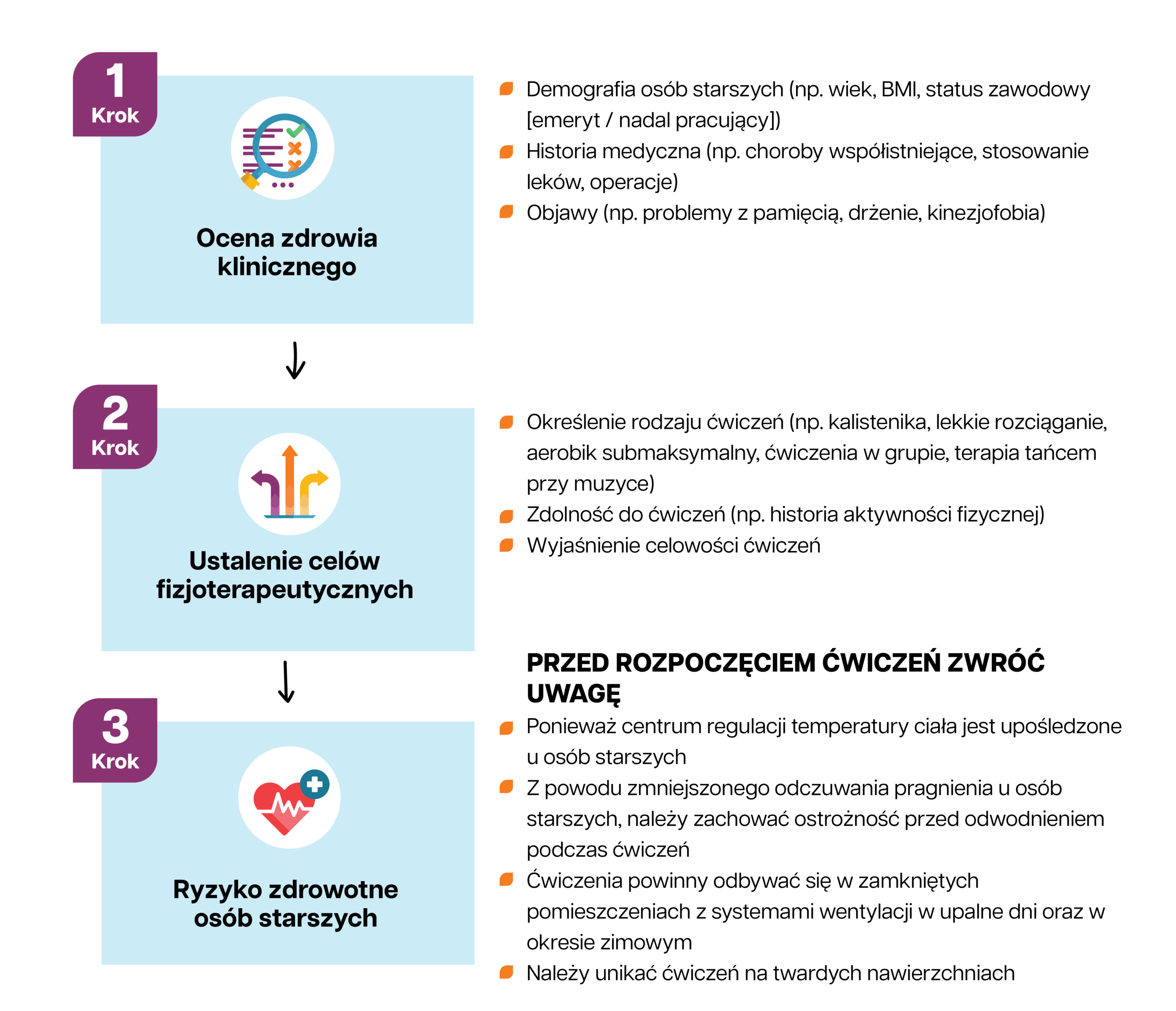 Odpowiednie podejście fizjoterapeutyczne do zdrowego starzenia się obejmuje między innymi ćwiczenia kalisteniczne, terapie muzyczno-taneczne, ćwiczenia poznawcze itp. Przy podejmowaniu decyzji o formie terapii należy wziąć pod uwagę aktualny stan kliniczny osoby starszej oraz poziom dotychczasowej aktywności fizycznej. Ocena stanu klinicznego osoby w podeszłym wieku obejmuje ocenę stanu fizycznego i psychicznego, w celu wykrycia ewentualnych chorób i dolegliwości.