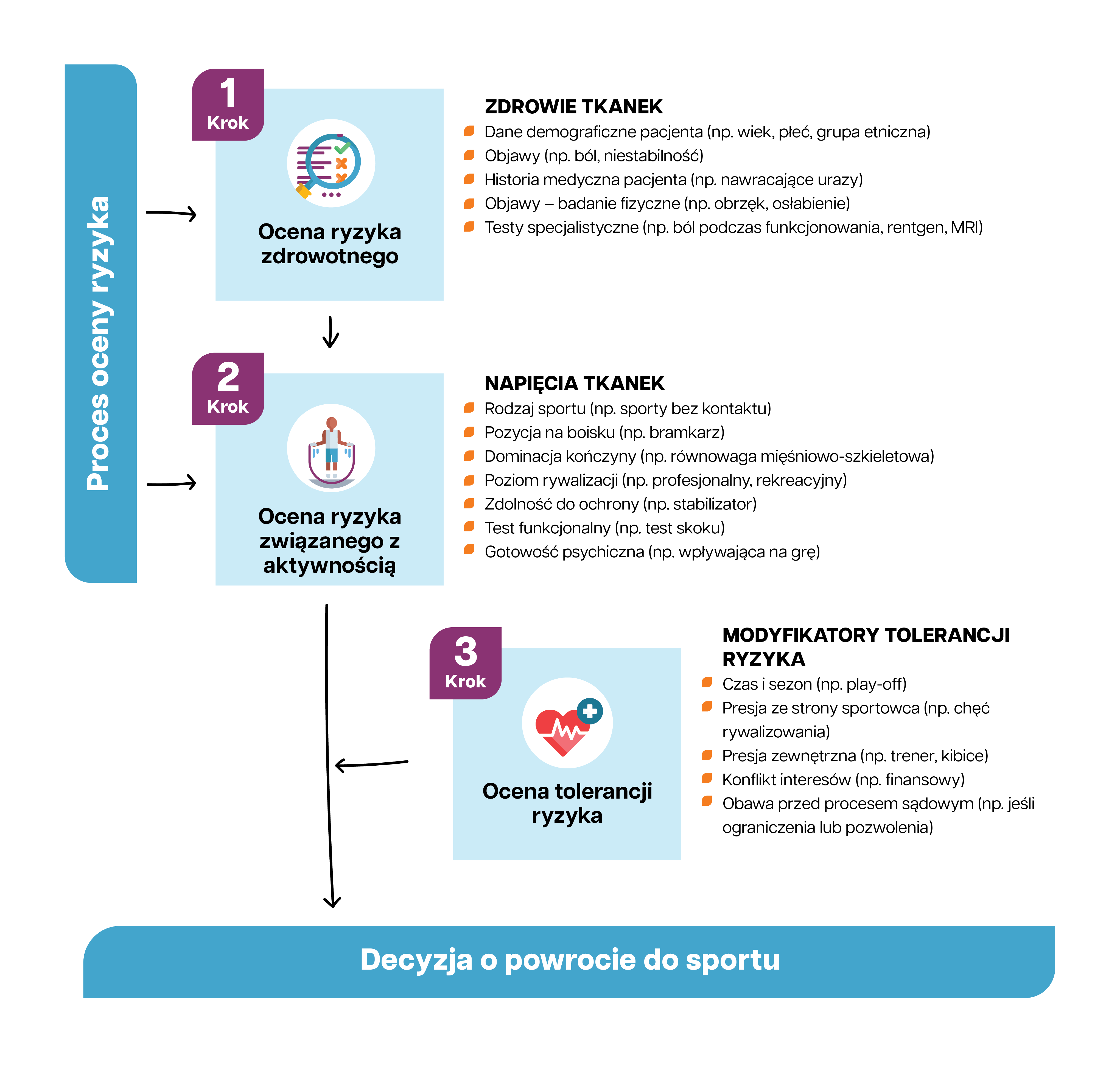 Decyzja o powrocie do sportu po urazie powinna uwzględniać stan kliniczny pacjenta, jego stan psychiczny oraz krótko- i długoterminowe cele sportowe. Podejmując taką decyzję zawsze próbuje się znaleźć balans pomiędzy zdrowiem sportowca a jego skutecznością na boisku. Niestety zawsze jest to obarczone ryzykiem. Zbyt wczesny powrót do gry może mieć negatywne konsekwencje dla zdrowia sportowca (np. ponowny uraz), zbytnia ostrożność i odwlekanie decyzji o powrocie może wyeliminować sportowca z ważnych zawodów i spowodować, że straci on pozycję w drużynie. Decyzja o powrocie do sportu jest zazwyczaj wspierana opiniami wielu osób. Istotny głos należy do lekarza i fizjoterapeuty, ale liczy się także zdanie psychologa, trenera i najbliższego otoczenia sportowca. Ostatecznie jednak to on sam podejmuje finalną decyzję. W tym momencie bardzo ważna jest edukacja na temat istoty urazu i jego konsekwencji, ponieważ badania pokazują, że sportowcy często zaniedbują długoterminowe prognozy zdrowotne i postanawiają wracać do gry najszybciej jak to możliwe dla nieodległego w czasie sukcesu sportowego. Sportowcy zazwyczaj łatwo podejmują decyzję o zbyt wczesnym powrocie do gry, gdy jest im dostępny czynnik zmniejszający ryzyko. Może to być podpowiedź, by na czas uprawiania aktywności założyć stabilizator lub być aktywnym na mniej niż 100%, ewentualnie grać dopóki nie boli, “w każdej chwili możesz zejść z boiska, ktoś cię zastąpi”. Biorąc pod uwagę dobro sportowca, pożądane jest, aby decyzja o powrocie do sportu była podejmowana bardziej świadomie, w oparciu o dokładną analizę stanu zdrowia i ryzyka. Pomocne w tym mogą być normatywne narzędzia jak na przykład StaRRT.
