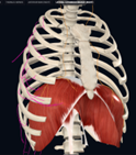 • żebrową (boczną) – przyczepia się do chrząstki od szóstego do dwunastego żebra zazębiając się z przyczepami mięśnia poprzecznego brzucha;